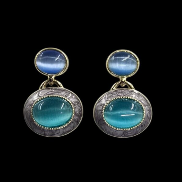 Exquisite dual-stone designer earrings featuring captivating cat’s-eye gemstones in ocean blue tones. The upper stud showcases a soft sky-blue cabochon, while the larger lower oval stone radiates a deep aqua shimmer, both bordered by intricate gold detailing and antique silver frames. Perfect for elegant evening wear, these earrings blend luxury craftsmanship with timeless sophistication, adding a graceful touch to any outfit.