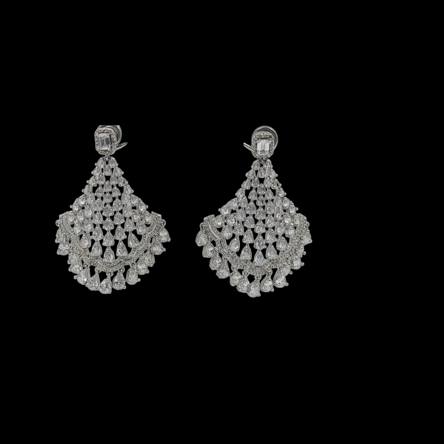 Elegant American diamond chandelier earrings featuring a square-cut stud top and intricately layered lattice design. Sparkling teardrop stones cascade gracefully, forming a luxurious fan-shaped silhouette. Crafted in a silver-tone finish, these statement earrings exude bridal glamour, sophistication, and timeless red-carpet elegance.