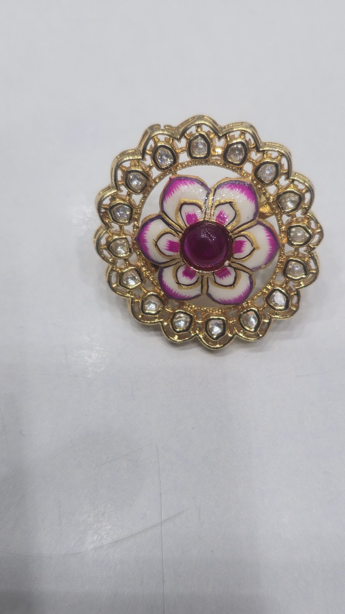 This beautifully designed ring features a dazzling arrangement of premium white stones, crafted to create a bold and elegant look. The large, eye-catching design makes it a perfect statement piece for special occasions and festive wear.