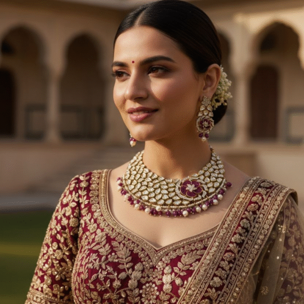A regal Kundan choker set beautifully handcrafted with uncut kundan stones, ruby red accents, and a floral motif centerpiece. The design is finished with delicate pearl edging and paired with matching earrings — a perfect blend of royal tradition and timeless elegance, ideal for maroon or gold bridal ensembles. ✨