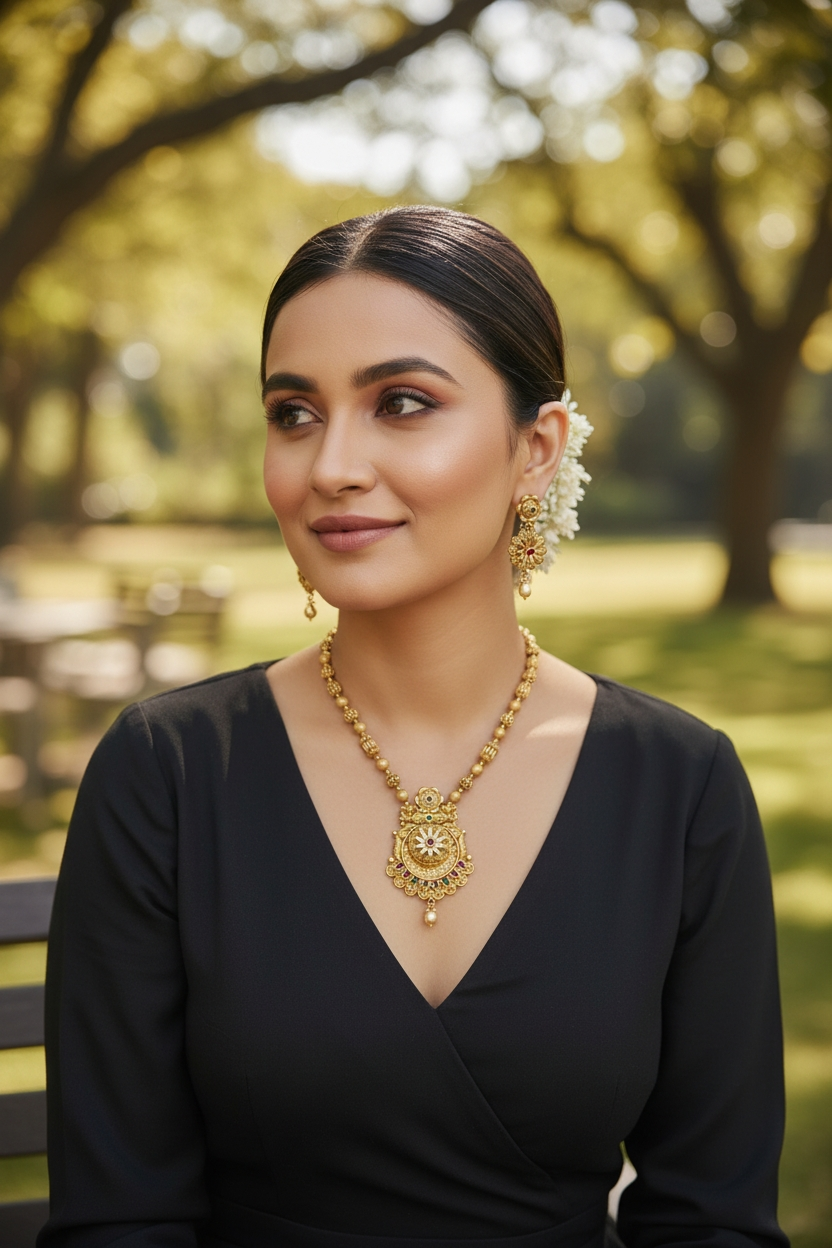Embrace divine elegance with this exquisitely crafted Navratan Flower Temple Necklace, inspired by traditional temple jewellery and adorned with vibrant navratan stones for a truly royal look.